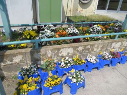 2年生が1年生の時に植えたパンジーは、今、お日さまの光をうけてきれいに咲いています。観察池の池の上には、桜の花びらがいっぱい散って、花びらでいっぱいです。気温も高くなり、オタマジャクシも生まれてくることでしょう。