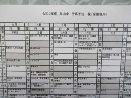 保護者会でお配りする予定だった烏山小学校の年間行事予定表です。トップページの「年間・月行事予定」のタブをクリックしてください。これは、現在の状況になる前に作成したものです。今後予定は変わってきますのでご了承ください。1学期に予定されている運動会、川場移動教室(5年生)、河口湖移動教室(わかば学級4年生以上)、日光林間学園(6年生)等は、延期或は中止になる可能性があります。
