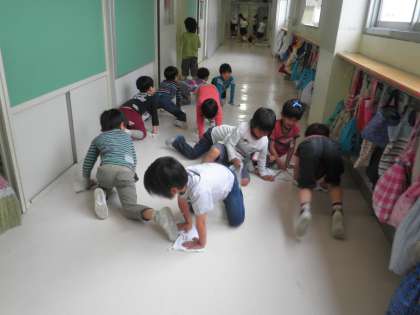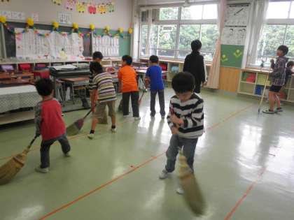 1年生の掃除の様子です。6年生に手伝ってもらいながら一生懸命に