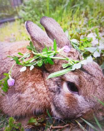 ぼくが今いるお家には、小さなお庭があります。お庭には、「カラスノエンドウ」という植物がたくさんあります。この前、「カラスノエンドウ」でかんむりを作ってもらいました。似合うでしょ?