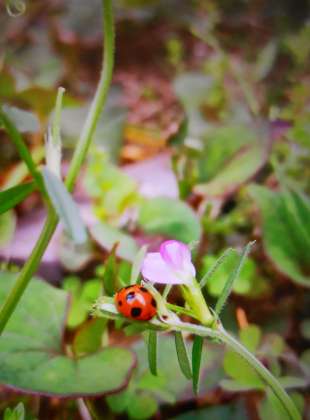 「カラスノエンドウ」の葉先にてんとう虫を見つけました。