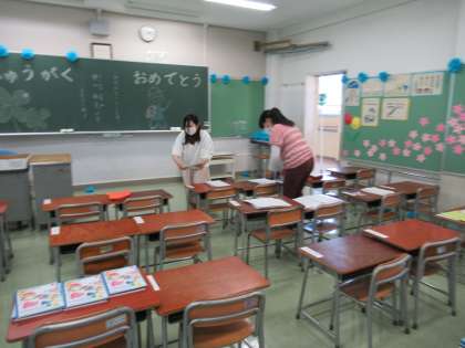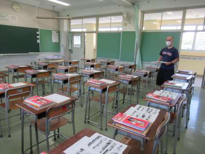 先生たちは、来週の登校日に備えて、時間割表、学習プリント、お知らせの手紙などの、用意が終わりました。みなさん、各教室では担任の先生が待っています。くつ箱では、専科の先生が待っています。久しぶりに会います。みなさんの元気な「おはようございます」という声を聞かせてください。