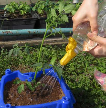 4.(写真左)土全体がしめるように、水をたっぷりあげましょう。