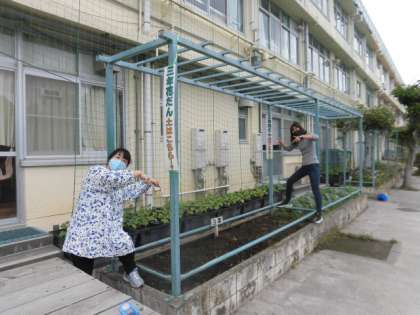 2枚目の写真は、みなさんが(必要な人だけ)持っていってよい土のある、3年生の花だんです。場所は分かりますか?校庭の朝れい台のすぐ横、放送室前です。