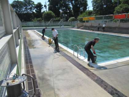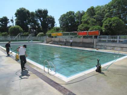 今、プールを組み立てて清掃をしています。今年は、プールはできませんが、メンテナンスのため、清掃をして、清掃が終わったら、また、ふたをします。6月8日には、見えなくなります。来週きたら、プールは組み立てられていますが、その次の週にはなくなっています。プールの水は、火事になった時使う「防火水槽」になっています。だから、水はきれいでないといけないのです。