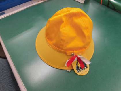 色別コースのリボンについて確認をお願いします。配布されたリボンは半分に切って、通学用の黄色い帽子とランドセルの横に付けます。下校時にリボンでコースの確認をしますので、しっかりと付けてください。黄色い帽子に付ける場所は写真を参考にしてください。よろしくお願い致します。