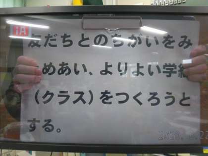 最後に看護当番の先生から、手洗いで使う場所や休み時間の遊ぶ場所のお話、今週の生活目標のお話がありました。今週の生活目標は「学校のきまりを守って生活しよう。」です。きまりをしっかり守って、安全に楽しく学校生活をおくりましょう。