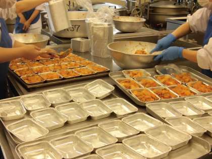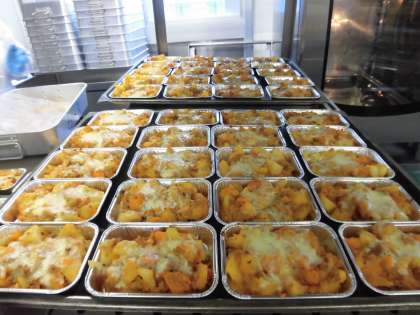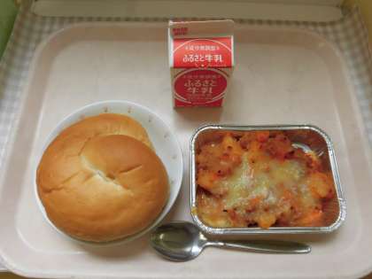 ☆今日の献立は「ポテトグラタン」です。グラタンに欠かせないじゃがいもを、たくさんの皮をむいて調理しました。みんなが食べやすいようにケチャップで味付けをし、オーブンで焼いています。