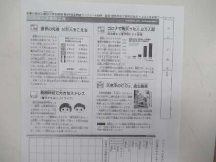 毎週水曜日の朝の時間、5,6年生は、「新聞記事を読んでコメントを書く」ということを今年度から始めました。NIE教育と言って、新聞に興味・関心をもち、社会のことを知っていく教育です。子どもたちは、4つの新聞記事から1つ選んで、書かれている内容を読み取り、感想を書いていきます。きっと、子どもたちは、新聞を読み取る力や記事の内容について考える力がつき、社会の情勢に関心をもってくれることでしょう。