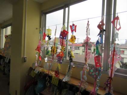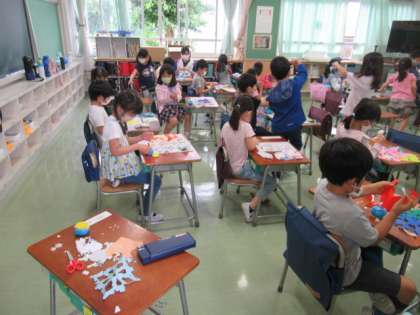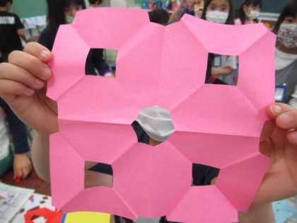 図工の授業で、折り紙を重ねて切ったりつなげたりして飾りを作りました。偶然できた形に喜び、おもいしろさを感じ好きなように作っていました。子どもの発想を育てています。みんなでつなげると素敵な飾りになりました。