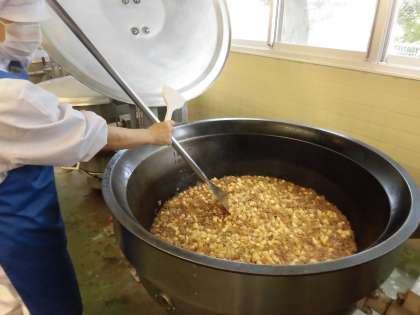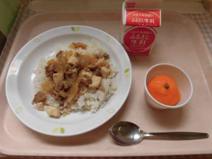 今日の献立は「豚丼」です。子ども達が食べやすいように調理しました。豚丼にはたくさんの野菜やお肉がは入っていて疲労回復の効果があります。そして果物は人気の冷凍みかんです。みんなで美味しく食べました。