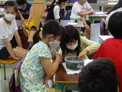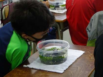 各学級には10個のミニ水槽が置かれ、それぞれ自分の担当したメダカの世話をしています。大切な命を次の世代に繋げようと、お世話を楽しみにしている子ども達です。