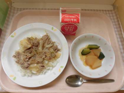 ☆今日の献立は「ねぎ塩豚丼」です。みんなが食べやすいように調理しました。豚丼にはたくさんの野菜や豚肉が入っていて、疲労回復の効果があるビタミンB1も多く含まれています。それに加え、レモン果汁も入っているので、夏バテ予防にもなります。