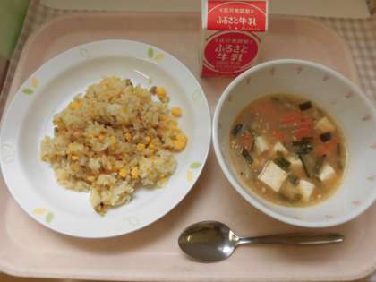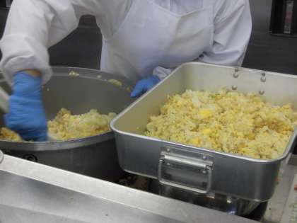 ☆今日の給食は「チャーハン」です。チャーハンにはたくさんの食材が使われています。(長葱 人参 干し椎茸 玉葱 卵 豚挽き肉)給食室の大釜で炒めて、炊いたごはんに混ぜました。そして、ちょっとピリ辛の麻婆汁も子ども達に人気です。