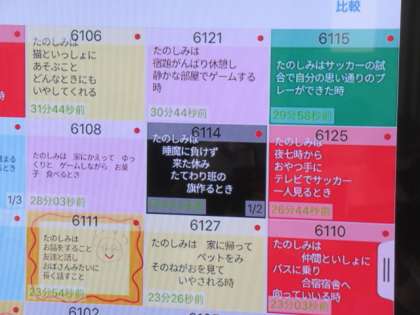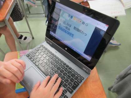 5,6年生は、タブレットで「ロイロノート」を使った学習をしています。それぞれの子どもの書いたものが、画面に一覧で出ます。友達の書いたものを自由に見ることができます。子どもたち同士の意見を共有できる対話的な学びが容易にできるツールになっています。
