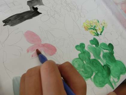 6年生は、それぞれの心の中にイメージした花を、色鮮やかに描いています。いままでの学習で身につけたテクニックを使ったり、作品に合った画材を選んだり工夫しながら表現しています。