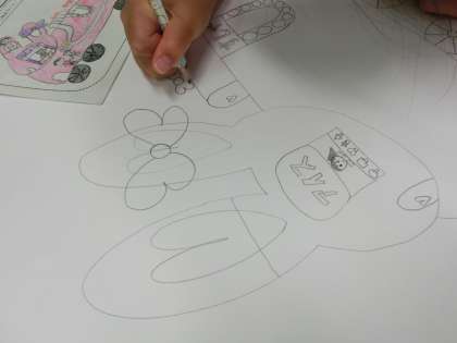 3年生は『ふしぎな乗りもの』をデザインしました。家庭学習でスケッチした身近にあるものに、タイヤやプロペラなどを取り付けて、家族や友達、好きな生き物などを一緒に乗りものに乗せました。