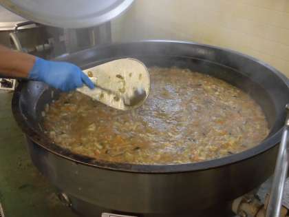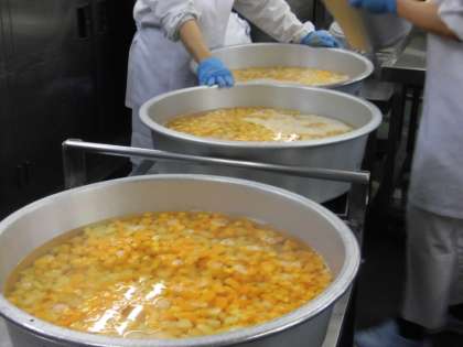 ☆今日の給食は「中華丼」です。今日は色々な食材が使われていて、何と10種類の食材が使われています。(ぶたにく いか えび うずら卵 たけのこ にんじん 干し椎茸 たまねぎ きゃべつ きくらげ)大釜で煮込んであるので、野菜の旨味もたくさんでていて栄養バランスがよい献立となっています。