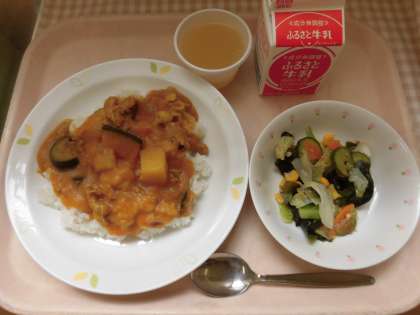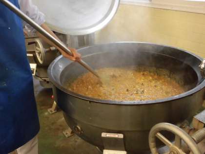 ☆今日の給食は「夏野菜カレーライス」です。カレーには、たまねぎ 人参 セロリ 南瓜 ナス トマト じゃがいも ズッキー二といった夏野菜をたくさん入れました。苦手な夏野菜もカレーに入れると美味しく食べられます。今日も給食室の大釜でたくさん作りました。