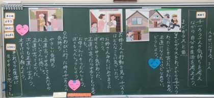 本校の授業は、「めあて学習」で行っています。「めあて、よそう、かんがえ、わかったこと、まとめ、振り返り」などのカードを貼って、子どもたちが主体的に問題を解決する(めあてを解決する)学習をしています。毎時間の終わりの先生たちの板書を見ると、どんな「めあて学習」をしたかよくわかります。授業を回ってみていると、どのクラスも子どもたちは、「めあて学習」をがんばっています。
