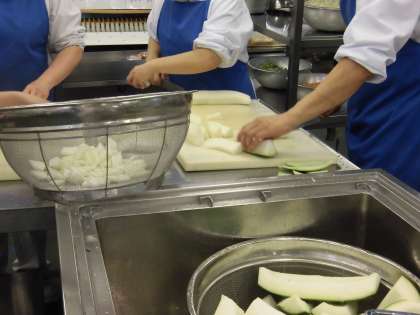 ☆今日は「冬瓜のみそ汁」です。冬瓜と聞くと、漢字で「冬」の「瓜」と書くので冬野菜と思われがちですが、実は夏が旬の野菜です。冬瓜はキュウリやスイカと同じウリ科の野菜です。夏に収穫したものでも、涼しい所で丸の状態で保管しておくと、冬まで保存できるため、その名前がついたといわれています。今日は旬の冬瓜を給食室でたくさん切り、みそ汁に入れました。