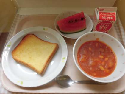 ☆今日は「はちみつレモントースト」です。レモンには夏バテに効果のあるビタミンCが多く含まれています。はちみつとレモンが合わさった、爽やかで酸味が人気のはちみつトーストです。そして今が旬のすいかも今年はじめて給食に登場しました。
