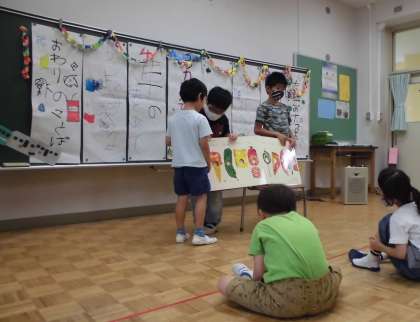 大型絵本「はらぺこあおむし」を3人で読み聞かせしました。途中にクイズを入れたり、全員で読むところを設定したりして、工夫して読んでいました。