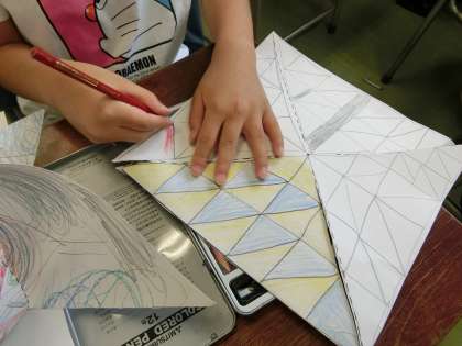 3年生は、1学期最後の授業で、お楽しみ工作をつくりました。自分の好きな絵や模様で彩られた画用紙を組み立て、竹ひごを通して風車を完成させました。