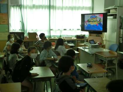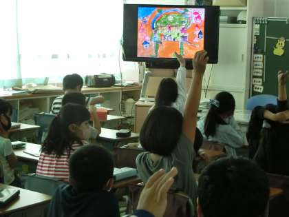 4年生は、完成した『へんてこ山』の作品鑑賞をしました。大型テレビモニタで映し出された友だちの作品を見ながら、何が山に変身しているのかをみんなで考え、発表し合いました。