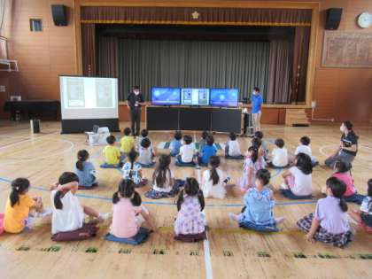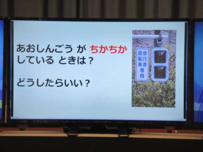 1年生は、歩行者シュミレータを使って交通安全教室を行いました。実際に車や自転車が動いている様子を見て、横断歩道を渡る練習をしました。映像がリアルで子どもたちが実感できたようでした。