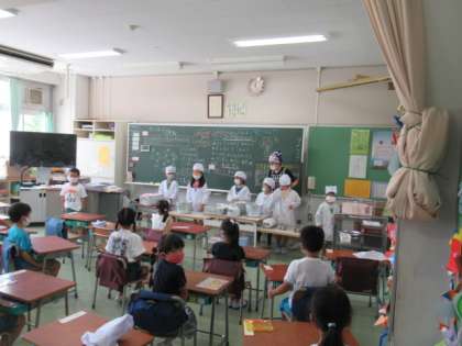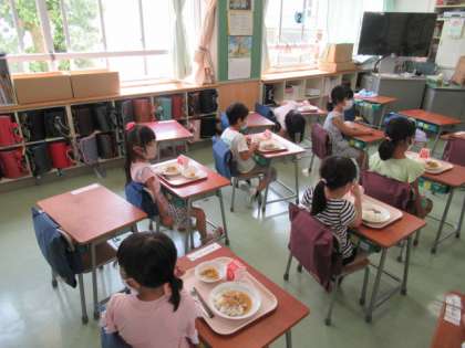 今日から給食が始まりました。子どもたちは楽しみにしていました。2学期からは、先生が配食することでおかわりができるようになりました。まだ、グループで食べることはできませんが、子どもたちは、前を向いてよく食べていました。