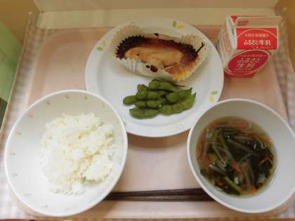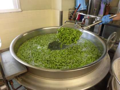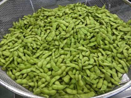☆今日の給食は「だだちゃ豆」です。だだちゃ豆は、土地と天候の条件が揃わないと味が落ちてしまうため、だだちゃ豆は「枝豆の王様」といわれています。だだちゃ豆はさやの毛が茶色いところと、えだ豆より香りと甘味が強いところが特徴です。今日は山形県鶴岡市から届いた、だだちゃ豆を給食室の大釜で茹でました。だだちゃ豆の、香りと甘味をみんなで楽しみました。