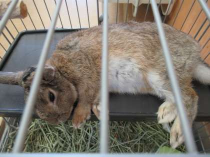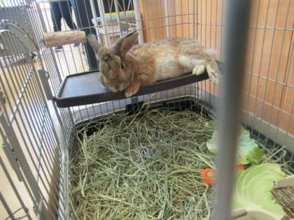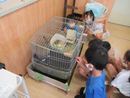 烏山小学校で飼っているウサギの「むぎ」は、夏の暑さに弱いので、今は、校長室にいます。冷房がきいた校長室の中で、ゆったりと快適に過ごしています。時々、子どもたちが来て「むぎ」の様子をみています。飼育委員会の人が毎日掃除をしてくれます。給食室の残りの野菜ももらっています。とてもよい環境で暮らしています。