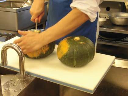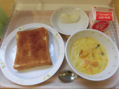☆今週、給食では夏野菜を使用したメニューにしています。今日は南瓜をたくさん使用した、「パンプキンシチュー」です。南瓜にはβカロチンという栄養が多くふくまれていて、夏バテを防止する効果もあります。