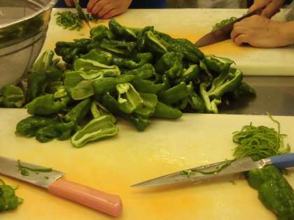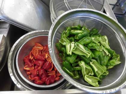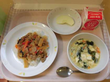 ☆今日の献立は「スタミナ丼」です。スタミナ丼には、豚肉やピーマン、赤ピーマンといった夏野菜が入っています。豚肉には疲労回復に効果のあるビタミンB1が多く含まれていて、ビタミンB1の吸収を高める、にんにく、にんじん、ピーマン等が入り栄養バランスがよい献立になっています。暑い日にピッタリですね!
