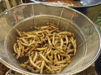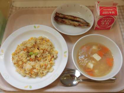 ☆今日の給食は「ししゃものピリ辛葱ソース」です。ししゃもは、給食室の大釜でカラット揚げました。揚げたししゃもに、葱ソースをかけてみんなで食べました。