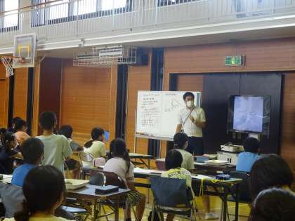 上祖師谷中学校の先生も参観に来られる中、体育館で 理科「川と災害」の学習を行いました。