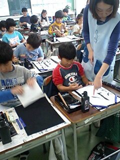 3年生から毛筆を学習します。今日は漢字の「小」を書きます。゛はね゛に気をつけながら一生懸命書いていました。