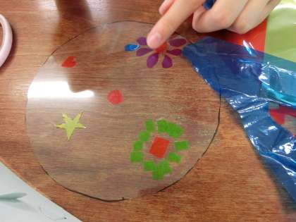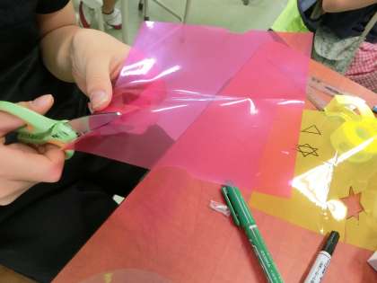 セロハンを貼っては、窓の外からの太陽の光や天井の電気にかざして、何度も何度も見え方を確認する様子が、とても微笑ましかったです。次回は、LEDライトを使って、作品の鑑賞会を予定しています。