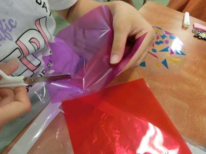 6年生は、光を使った作品づくりに挑戦しています。それぞれ作品のテーマに合わせて、カラーセロハンやカラーペンを使って表現活動に取り組んでいました。
