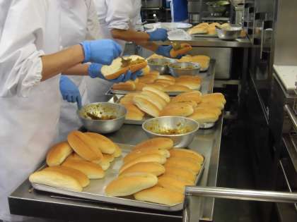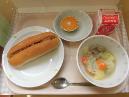 ☆今日の給食は「ドライカレードッグ」です。たくさんの野菜をみじん切りにし豚挽き肉と一緒に炒め、調味料を入れてドライカレーを完成させました。1つ1つパンの中に調理員さんが、心を込めてドライカレーを詰めています。感謝して食べたいものですね〜
