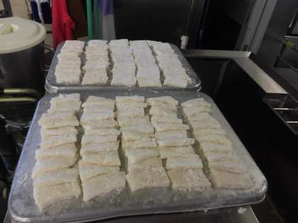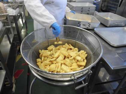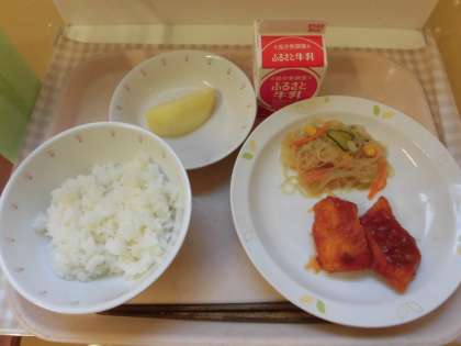 ☆今日の給食は「いかのチリソース」です。いかに粉を付けて、給食室の大釜で揚げました。少しピリ辛のチリソースをかけて完成です。麦ごはんと一緒に食べると尚おいしいですね。