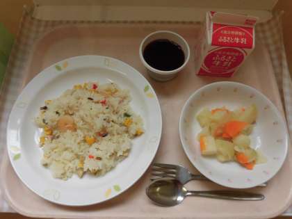 ☆今日は、子ども達の好きな「ぶどうゼリー」です。給食のゼリーは寒天とゼラチンの両方使っています。給食室の大釜でゆっくり煮溶かして、ぶどうジュースを入れてゼリー液を作り、1つ1つカップに入れて作りました。子ども達に人気のメニューの1つです。