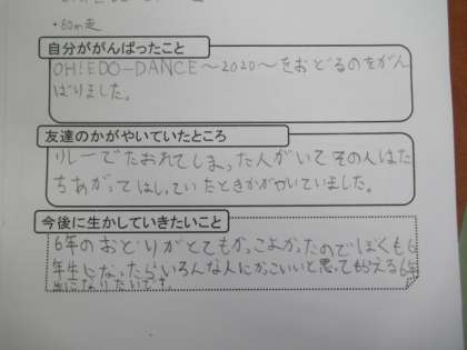5時間目に運動会の振り返りを行いました。低、中、高学年の3つの様式です。振り返りの項目は、「自分ががんばったこと」「友達が輝いていたところ」「今後にいかしたていきたいこと」です。子どもたちは、成し遂げた成就感を味わって書いていました。