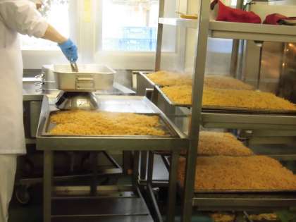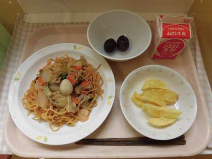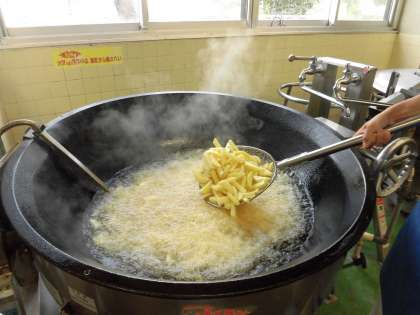 ☆今日は子ども達の好きな「フライドポテト」です。たくさんのじゃがいもを皮をむき、包丁で切って、給食室の大釜で揚げました。じゃがいもは約60キロあるので、時間もかかります。そして揚げたじゃがいもに塩 こしょうをふって完成です。