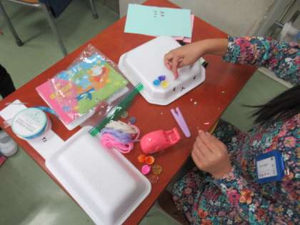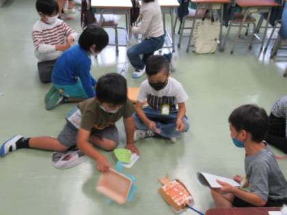 図工「ふわふわゴー」の学習では、お家から持ってきた食品トレーに色を塗ったり飾りを付けたりして、とっておきのおもちゃに変身させました。うちわ等で風を送ると、ふわふわと動きました。どうしたらもっと動くのか、もっともっと工夫できるところはないかと考えながら、夢中で作っていました。