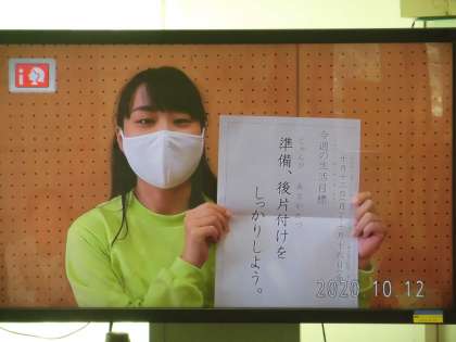 今週の生活目標は「準備、後片付けをしっかりしよう。」です。一人ひとりが意識をしてよりよい学校生活を送れるように心がけましょう。
