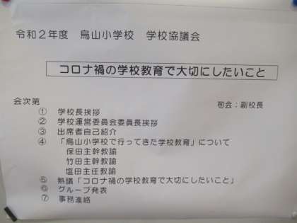 地域や保護者の代表の方々と学校で組織する「学校協議会」が、今年度初めて行われました。1学期に第1回を行う予定でしたが、新型コロナウイルス感染症拡大防止のため中止になっていました。今日、29人の地域や保護者の方と、全教員が集まって、「コロナ禍の学校教育について大切なこと」について、話し合いました。子供たちのためにできることをしていくことを共有しあいました。