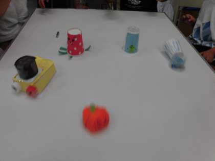 絵を描いたり、しっぽや耳をつけたり、容器をいくつもつなげたり、たくさん工夫をして思い思いのおもちゃを作りました。みんなで坂道を転がして楽しみました。