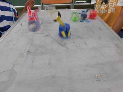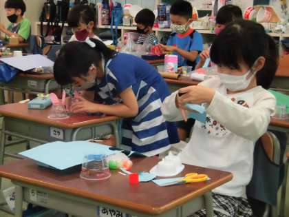 2年生は図工の授業で「コロコロ大さくせん」の学習を行いました。紙コップやプリンの空き容器などと、ビー玉やゴルフボールなどのコロコロエンジンを使って、坂道を転がりながら不思議な動きをするおもちゃを作りました。